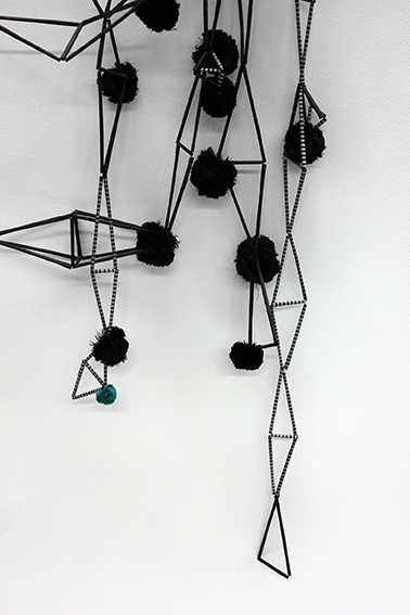 This artwork is about the activity of doing research; experiments, observations, measuring, interventions, and analysis – actions and activities of research that are immersed in affect. The loop, wingspan and length describe the endless junctions and flights, my arm span, and a length of time. These are the links that affect catches onto; they huddle into black swampy clumps, gathering in the strange shapes of experiences, and snag into the points of just touching. Grasping at that affect, and grasping at my attempt to measure that affect is how this works.