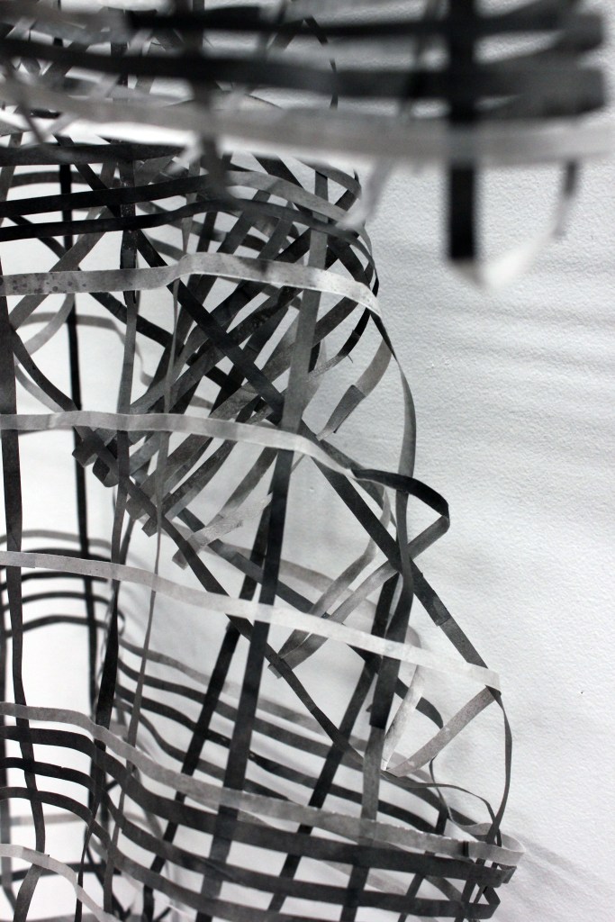 To make these works, rice paper printed with oil-based inks repel the watercolour and translucent inks used to colour the papers. They are then sliced, made into long lengths and then formed into grids using archival glues. Meshwork grids are constructed, which are then formed into three-dimensional forms, and are held from the wall with pins. The meshwork is considered as a filter; the pins are holding on to a moment of movement in time, the white printed marks and grey graduated washes represent the moments of time held by the bags, leaking and holding form at the same time.