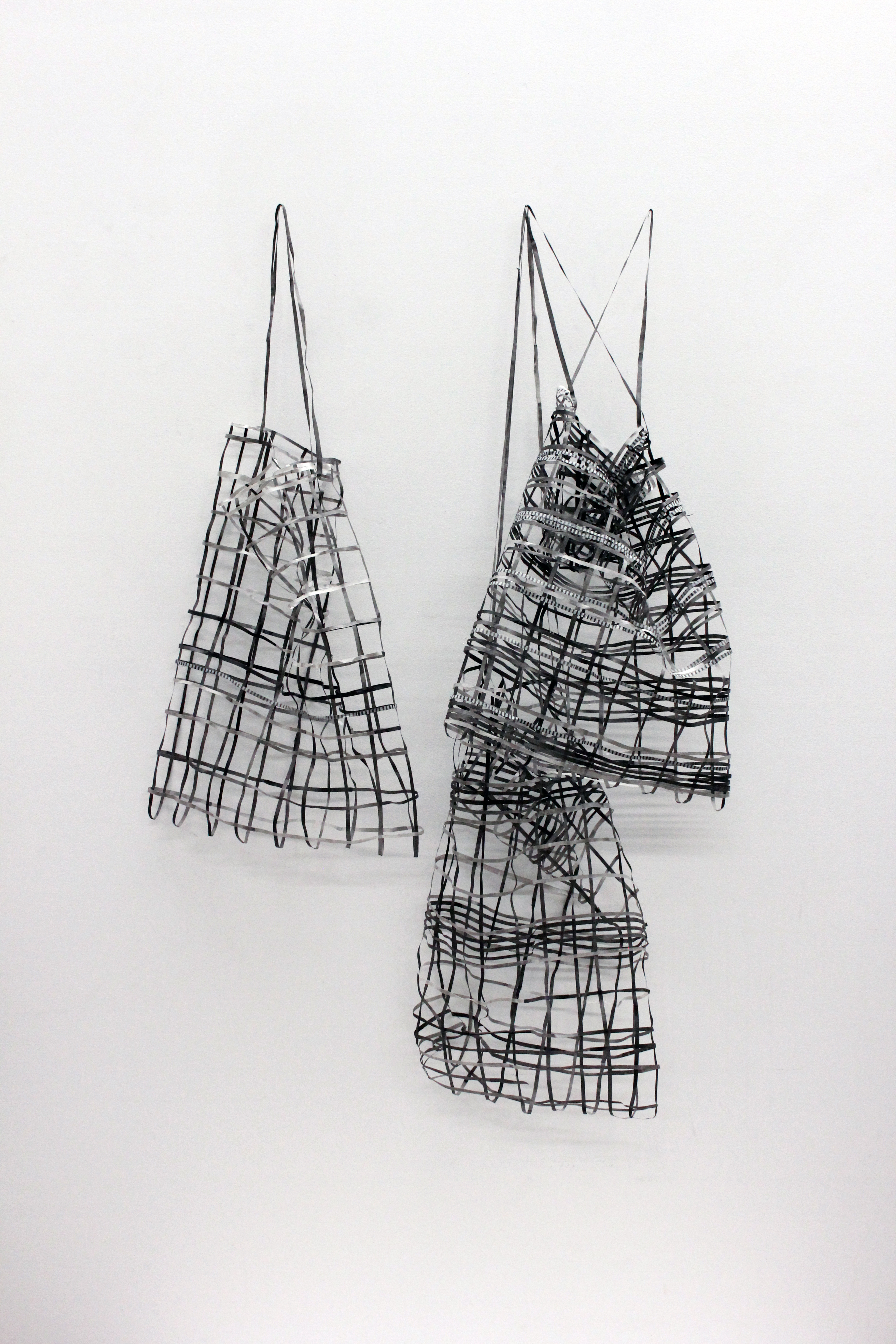 To make these works, rice paper printed with oil-based inks repel the watercolour and translucent inks used to colour the papers. They are then sliced, made into long lengths and then formed into grids using archival glues. Meshwork grids are constructed, which are then formed into three-dimensional forms, and are held from the wall with pins. The meshwork is considered as a filter; the pins are holding on to a moment of movement in time, the white printed marks and grey graduated washes represent the moments of time held by the bags, leaking and holding form at the same time.